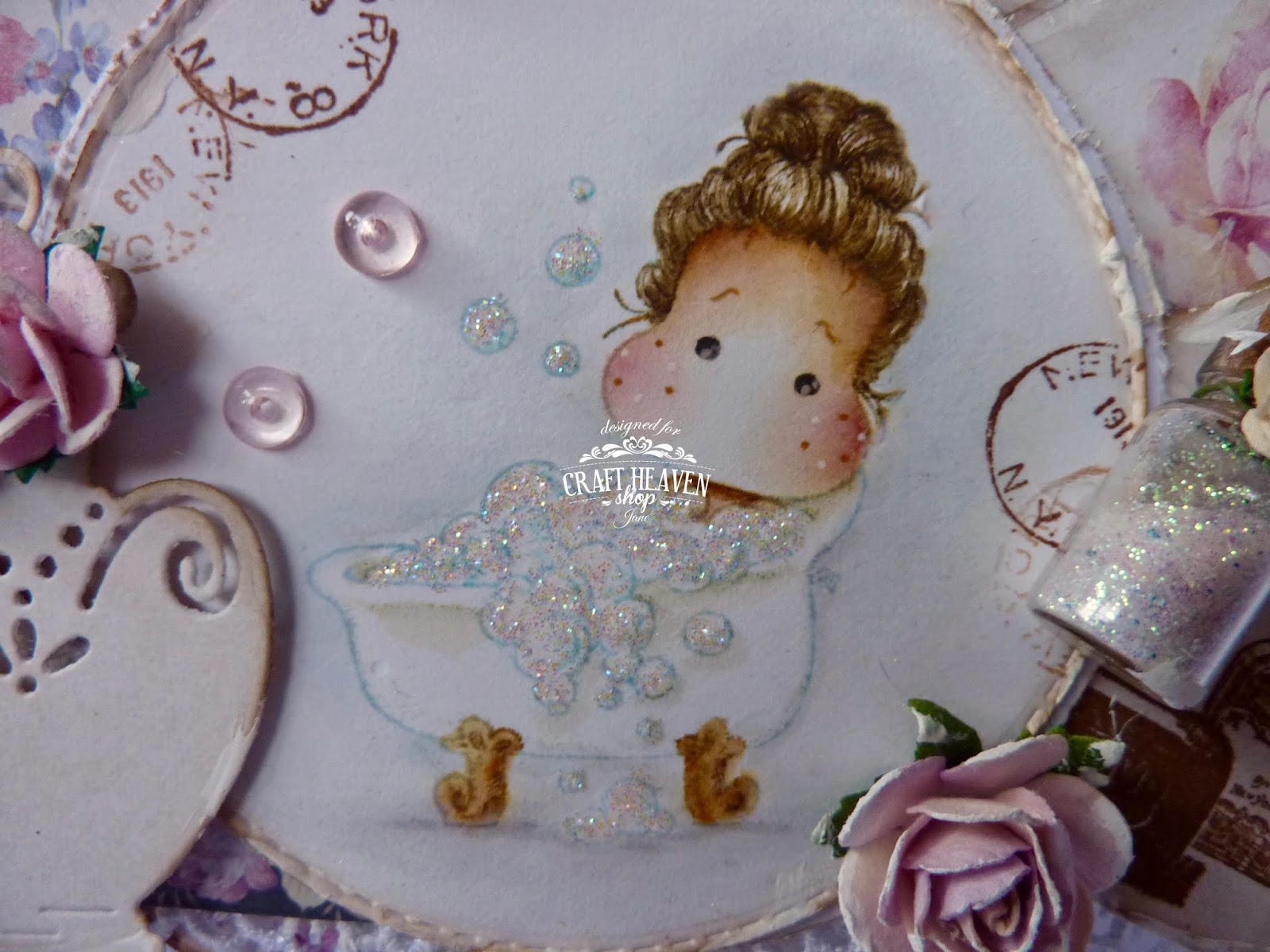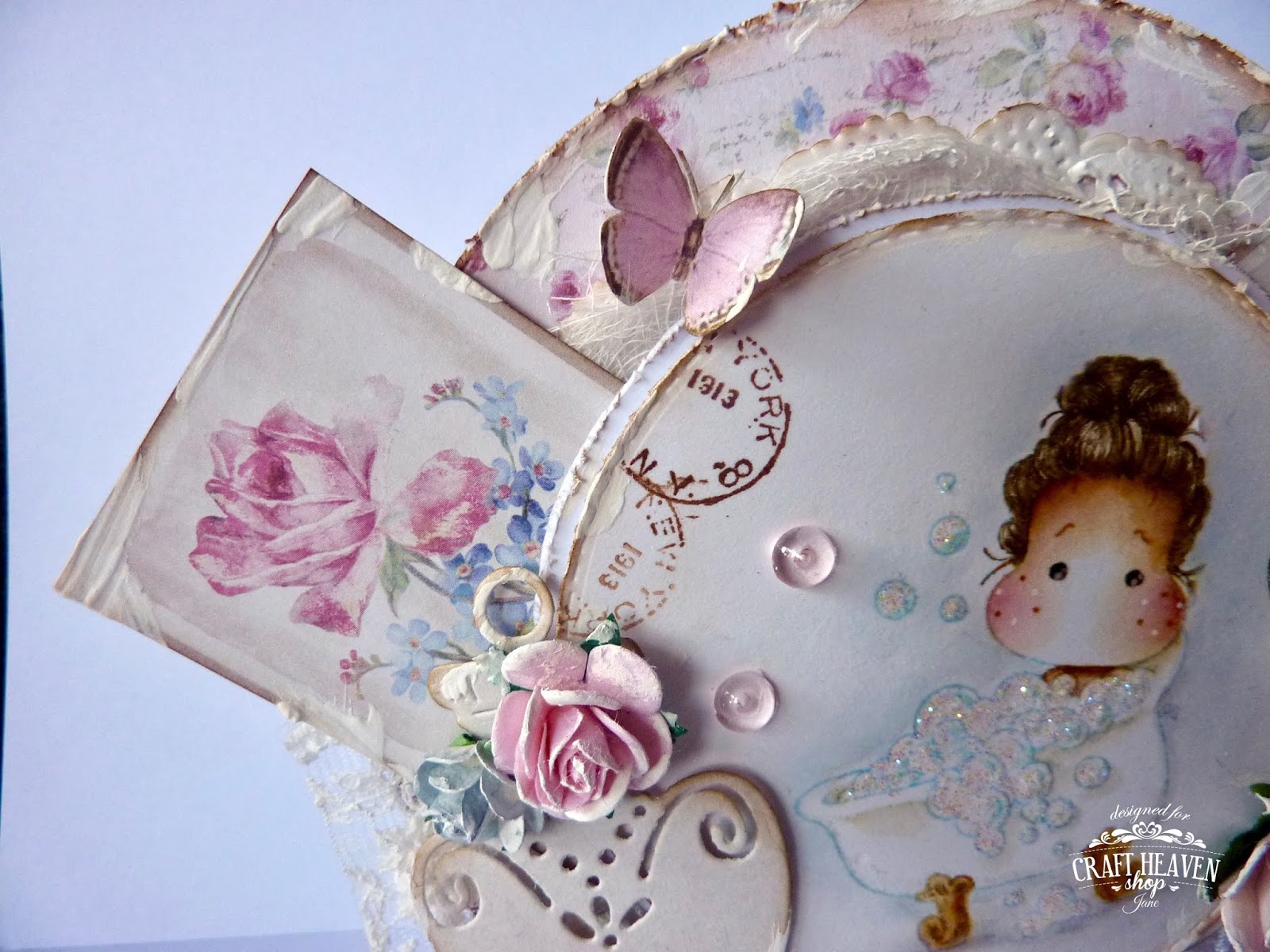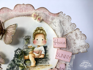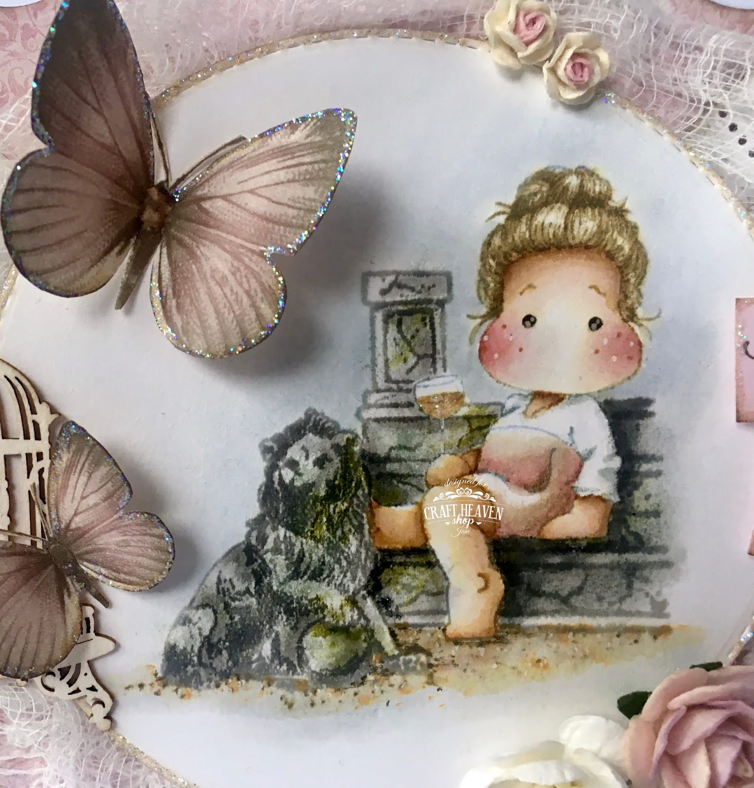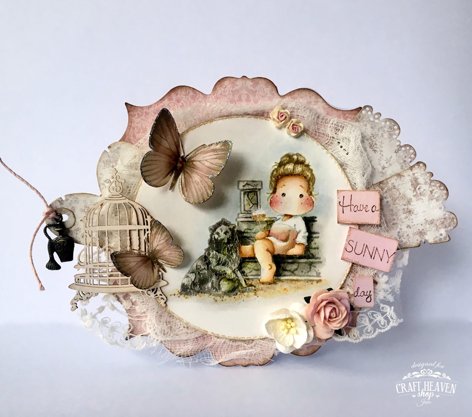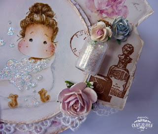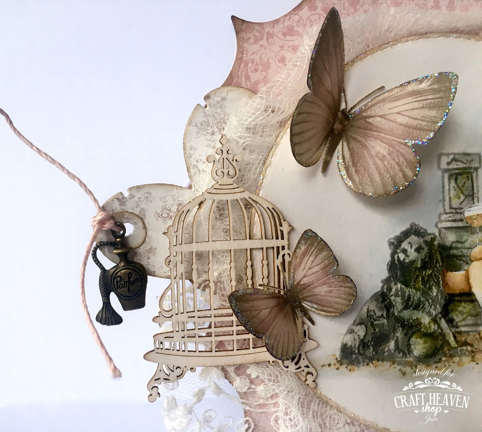 I've added a gorgeous Scrapiniec birdcage and some butterflies cut from a Pion Design paper. The heart tag was cut with the Magnolia Heart Tag Doohickey and the perfume charm is from Craft Heaven.